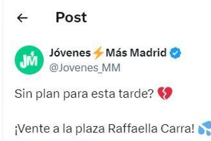 "¿Sin plan para esta tarde? ¡Vente a la plaza Raffaella Carra! ¿Cómo vamos a formar un proyecto de vida si tenemos que pedir permiso para f0llar hasta los 30 años?", han escrito los integrantes del grupo político en el tuit.