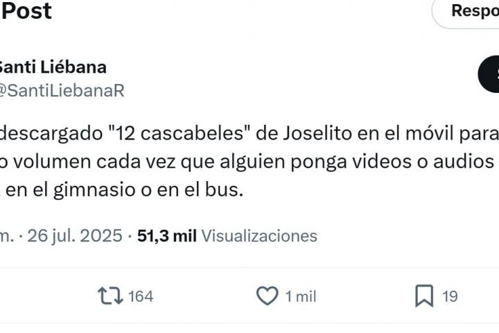 "Me he descargado "12 cascabeles" de Joselito en el móvil para poner a máximo volumen cada vez que alguien ponga videos o audios con el altavoz en el gimnasio o en el bus", reza su post explicando cómo combatirá a partir de ahora a esas personas. Así, muchos ya le han respondido dándole la enhorabuena por encontrar una solución tan elegante como efectiva, mientras que otros aseguran que seguirán sus pasos.