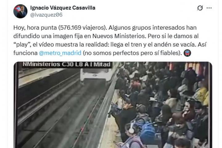 "Hoy (en referencia a este lunes), hora punta (576.169 viajeros). Algunos grupos interesados han difundido una imagen fija en Nuevos Ministerios. Pero si le damos al play, el vídeo muestra la realidad: llega el tren y el andén se vacía. Así funciona", ha escrito el consejero madrileño.