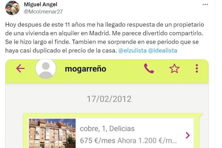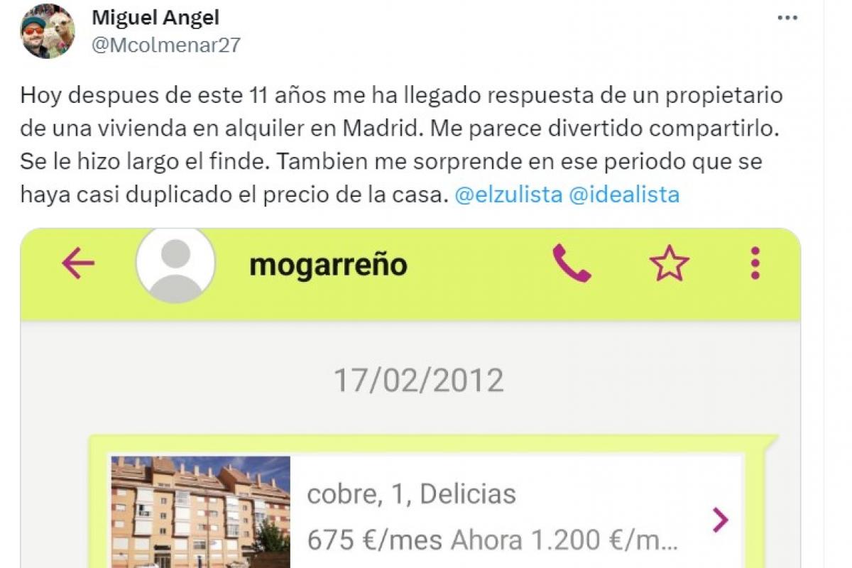 "Hoy después de este 11 años me ha llegado respuesta de un propietario de una vivienda en alquiler en Madrid. Me parece divertido compartirlo", ha escrito junto a un pantallazo en el se ve el mensaje que envío el 17 de febrero de 2012.