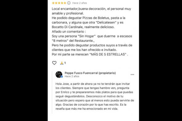 Ese usuario daba la máxima puntuación, alababa diversos platos del local y explicaba su situación: "Soy una persona 'sin hogar' que duerme a escasos ocho metros del restaurante. Pero he podido degustar productos suyos a través de clientes que me los han ofrecido e invitado. Por mi parte se merecen más de cinco estrellas".