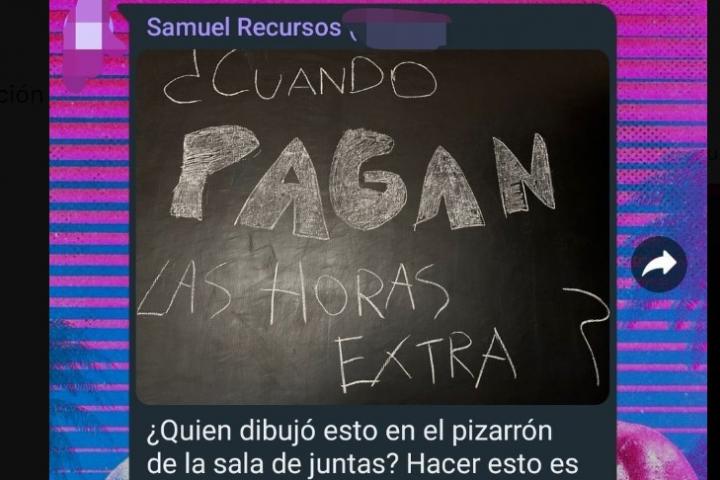 En los mensajes en cuestión, el responsable envía una fotografía de un mensaje que uno de sus trabajadores ha escrito en una pizarra, donde se lee: "¿Cuándo pagan las horas extra?".