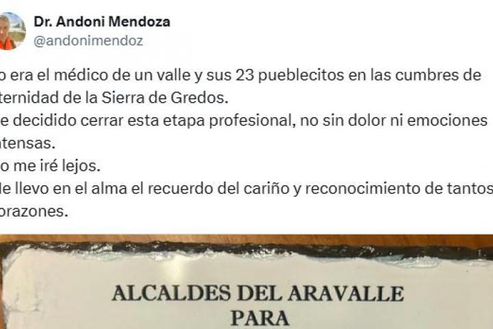 "Yo era el médico de un valle y sus 23 pueblecitos en las cumbres de eternidad de la sierra de Gredos. He decidido cerrar esta etapa profesional, no sin dolor ni emociones intensas. No me iré lejos Me llevo en el alma el recuerdo del cariño y reconocimiento de tantos corazones", ha escrito el sanitario.