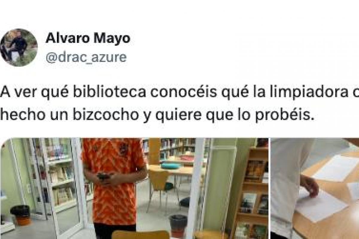 "A ver qué biblioteca conocéis qué la limpiadora os llame porque ha hecho un bizcocho y quiere que lo probéis", ha escrito este tuitero, añadiendo varias fotos del postre en cuestión que les había cocinado la trabajadora.