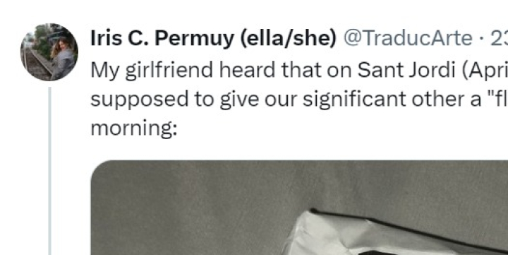 La tuitera Iris C. Permuy (@TraducArte) ha contado a través de su cuenta en la red social X una divertida anécdota que ha vivido con su novia por la celebración del día de Sant Jordi en Cataluña.