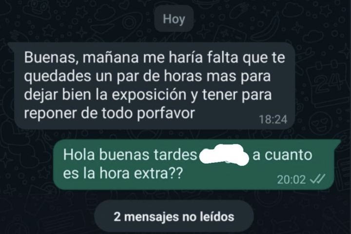 "Mañana haría falta que te quedases un par de horas más para dejar bien la exposición y tener para reponer de todo por favor", le pide a través de WhatsApp su superior. Esta persona pregunta: "¿A cuánto es la hora extra?".