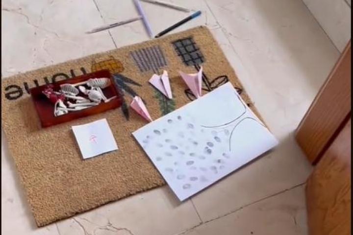 Tras recibir esta sorpresa, el niño no ha dudado en seguir con el juego y le ha dejado en la puerta a la usuaria varios aviones de papel, un dibujo, una cajita con esqueletos de juguete y unas flechas hechas con lápices de colores que van por las escaleras del edificio hasta llegar a su casa.
