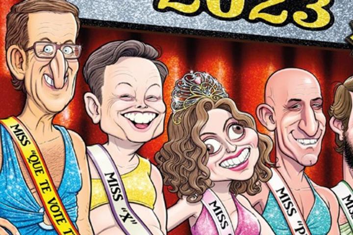 Entre los personajes que figuran en la portada aparece el líder del PP, Alberto Núñez Feijóo, con una cinta en la que se lee: "Miss 'que te vote Txapote". También Elon Musk, dueño de X, al que en el dibujo llaman "Miss X".