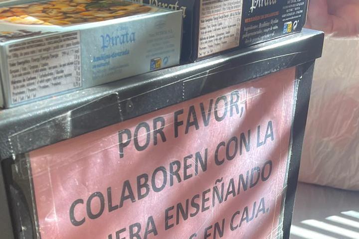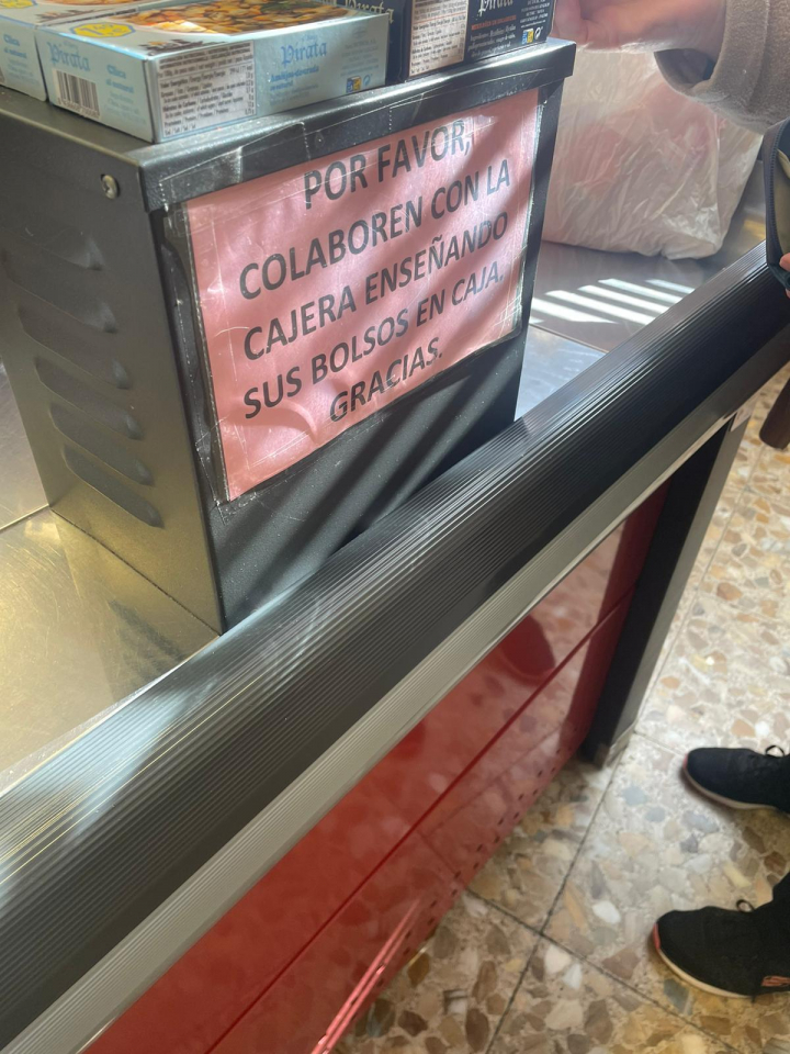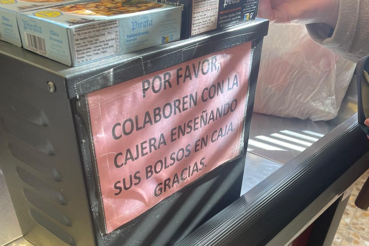 "Por favor, colaboren con la cajera enseñando sus bolsos en caja. Gracias", dice el letrero, escrito en grandes letras e impreso sobre una cartulina rosa, de tal forma que es imposible no verlo o que pase desapercibido.