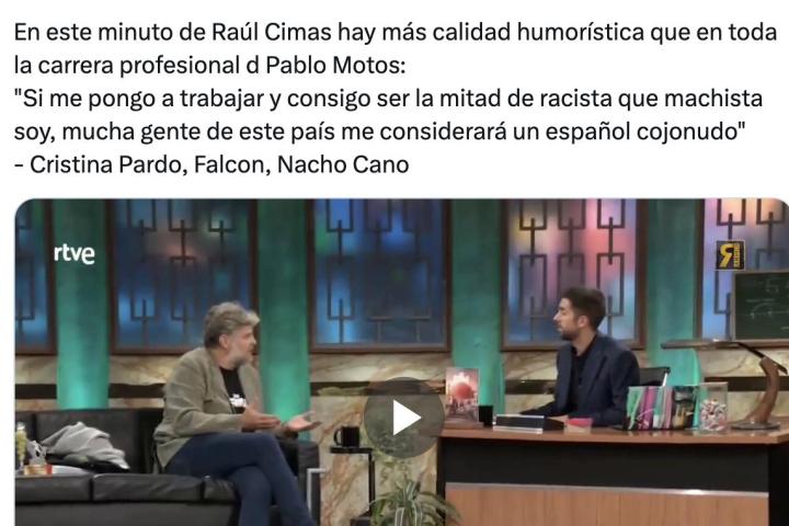 Raúl Cimas pasó se pasó el jueves por La Revuelta, el nuevo programa de David Broncano en TVE, y dejó una de esas reflexiones que sigue a día de hoy dando que hablar en redes sociales como X (antes Twitter).