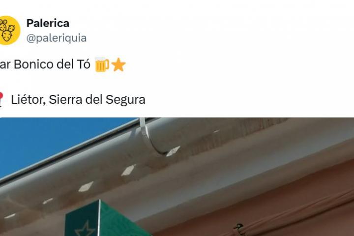 "Bar Bonico del Tó 🍺⭐ 📍 Liétor, Sierra del Segura", ha escrito la cuenta, mostrando la fachada del local en la que aparece el propio nombre junto a un letrero de la cerveza murciana Estrella Levante.