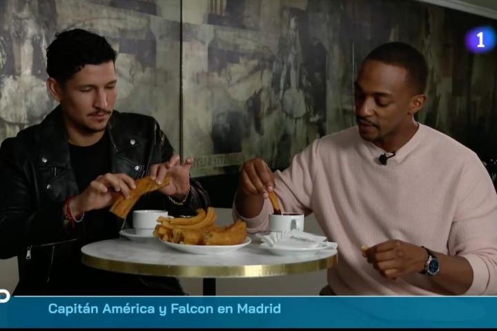 Como elemento curioso han llevado a Anthony Mackie y Danny Ramirez al centro de Madrid, concretamente a la Plaza Mayor, y les han dado a probar chocolate con churros —con churros y porras para ser exactos—.
