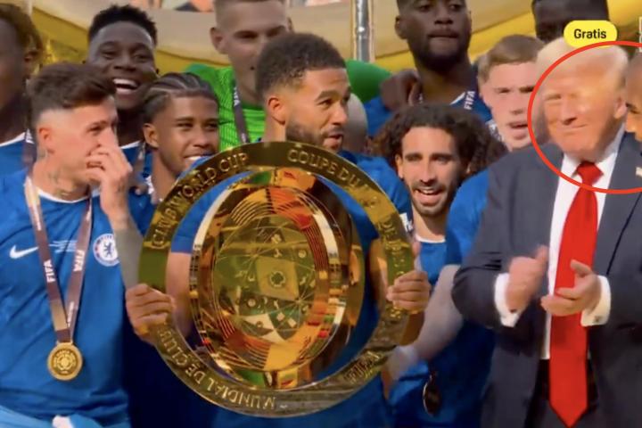 A la hora de entregarle el título al capitán del Chelsea, Reece James, Trump se ha quedado al lado y ha sido el portero español Robert Sánchez el que le ha advertido que ahora se iban a poner todos a brincar.