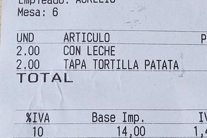 Lo llamativo es que el pincho de tortilla que ha pedido le ha costado nada más y nada menos que 6 euros. Al ser dos personas, la cuenta ha ascendido a 15,40 euros por desayunar.