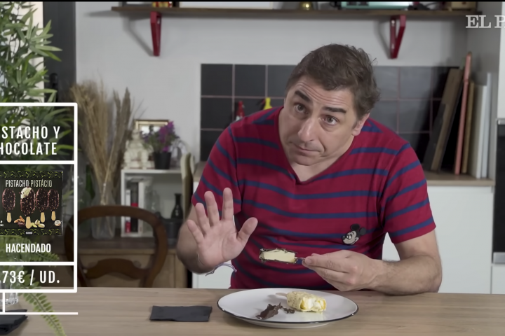 Una de las más curiosas es la del helado de pistacho y chocolate de Hacendado, la marca blanca de Mercadona: "Este es más pequeñito". "Se ha autodestruido", ha dicho de fondo Iturriaga porque el chocolate ha saltado por los aires. "Sí, como un mensaje secreto", ha dicho el pastelero.