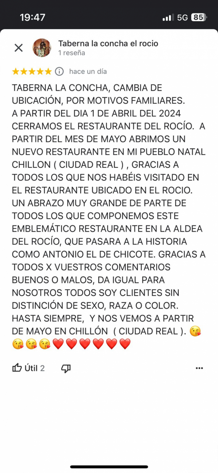 Ahora, Taberna La Concha ha emitido un comunicado en sus propias reseñas de Google en el que cuenta que cierra el local "por motivos familiares" a partir del 1 de abril de 2024. En mayo abrirán otro local en Chillón, Ciudad Real, donde está el pueblo natal de Antonio.