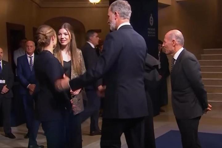 La infanta Sofía ha sido la siguiente en dar un abrazo, esta vez de medio lado, a su hermana para mostrarle su apoyo y su ánimo tras el discurso, justo antes de conversar con las personas cercanas que había alrededor. La periodista Pilar Eyre ha captado el momento tras la clausura de la ceremonia.