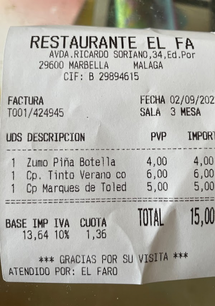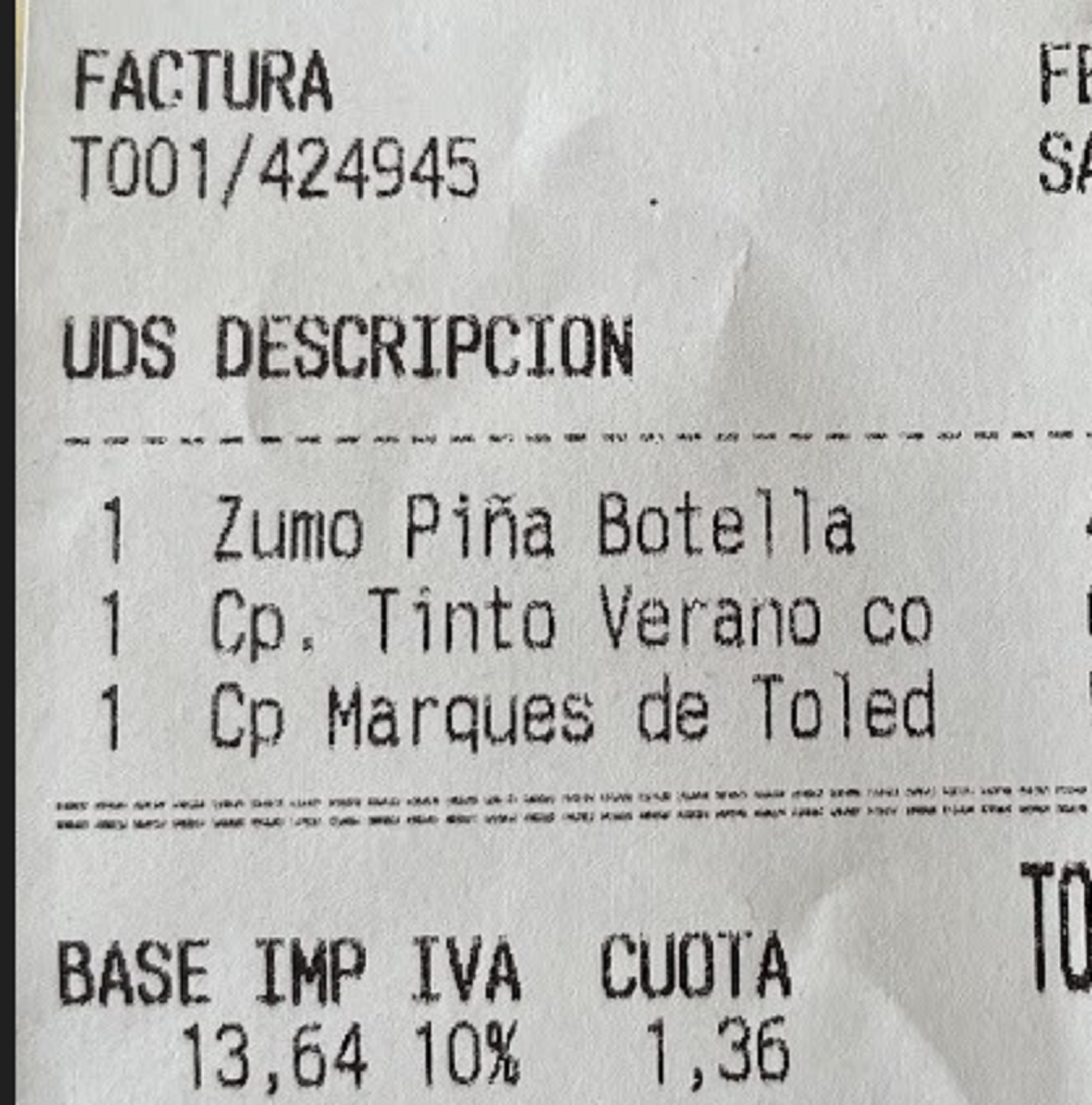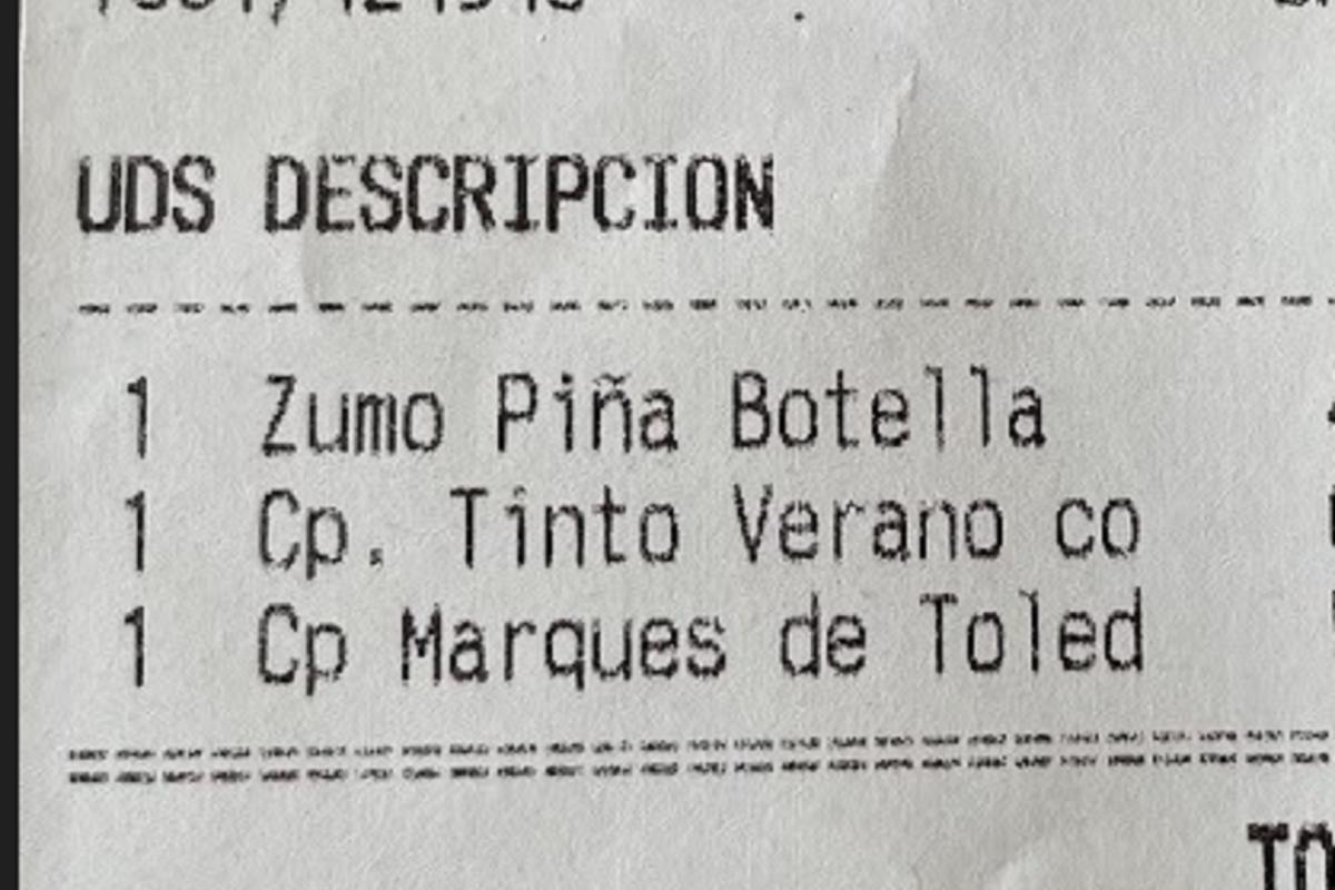 El montante total fueron 15 euros: cuatro euros del zumo, seis del tinto de verano y cinco del vino, un Marqués de Toledo cuya botella completa se puede adquirir en internet por 4,50 euros, más barato que la copa que sirvieron.