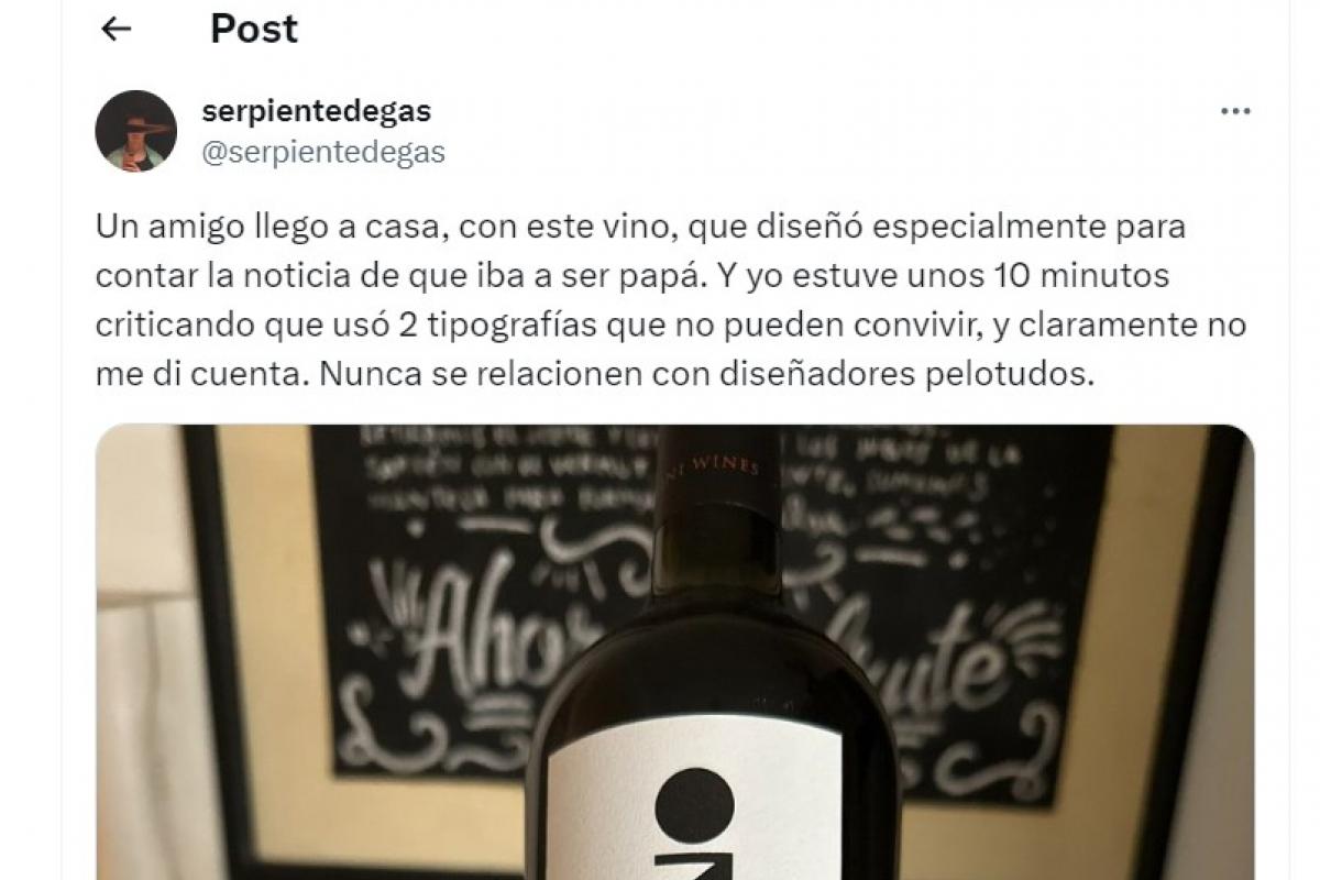 "Un amigo llegó a casa, con este vino, que diseñó especialmente para contar la noticia de que iba a ser papá", ha escrito el usuario junto a la imagen de la botella en cuestión.