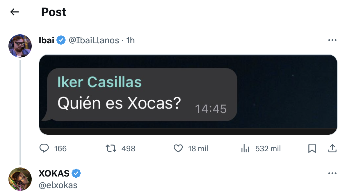 "¿Quién es Xokas?", escribió Casillas. "Qué cabrón. Una pena que ayer tampoco se pasase por el after kings", respondió Xokas en el mensaje de Ibai en X, anteriormente Twitter.