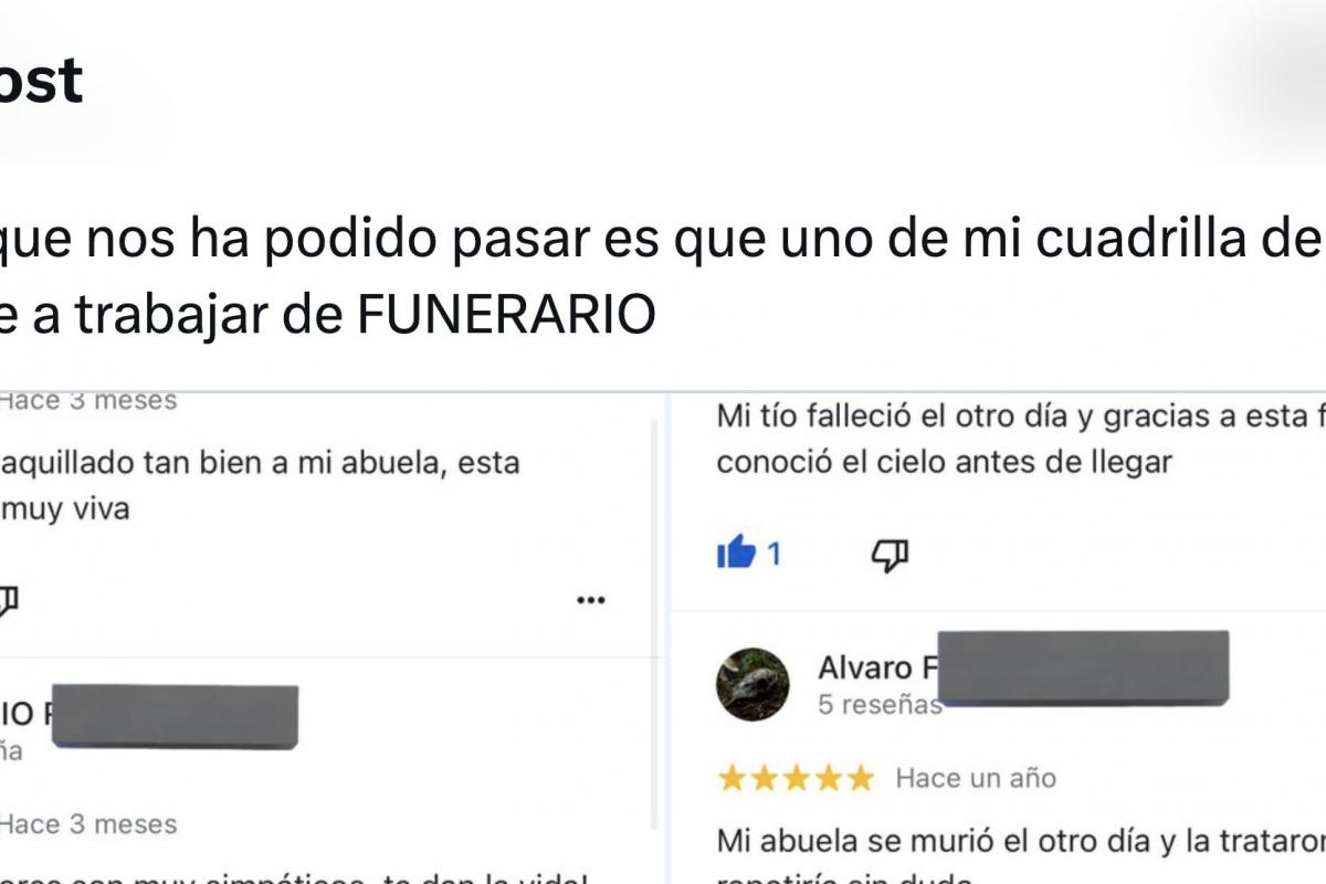 Pero ahora parece que hay otra utilidad: la de morirse de la risa. Se está viralizando en X, anteriormente Twitter, las reseñas que han dejado en Google los amigos de una persona que acaba de empezar a trabajar en una funeraria.