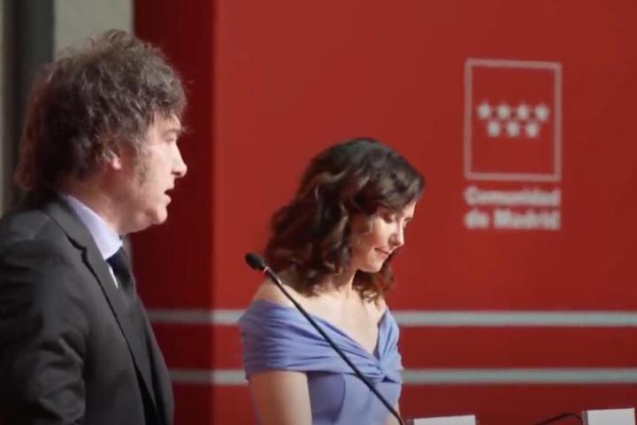 "Muchísimas gracias presidente de la Comunidad de Madrid por esta distinción. Muchísimas gracias por tu forma de ser", le ha dicho al inicio de su discurso Milei. Poco después, ha vuelto a mencionar a Ayuso como "la presidente".