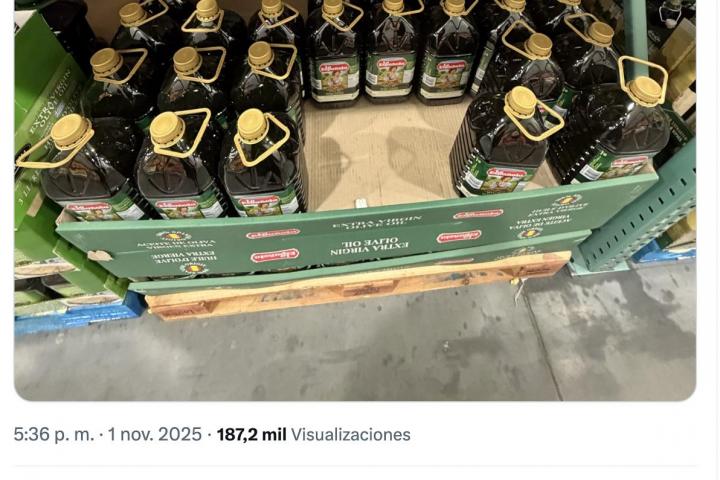 Por ejemplo, consultando algún supermercado como Mercadona, el precio del aceite de oliva virgen extra de Hacendado está a 4,65 euros el litro. En X se ha viralizado el precio del aceite de oliva virgen extra español en un Costco de Canadá y el precio es de alucinar.