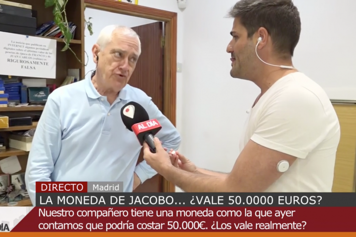 Jacobo Pérez, periodista del programa Cuatro al Día, lleva coleccionado muchos años monedas y ha visto que tenía una de esos raros céntimos en su poder, así que ha acudido a una tienda especializada en numismática para que se la tasen. El resultado es demoledor: lo que le darían realmente por esa moneda es... un euro.
