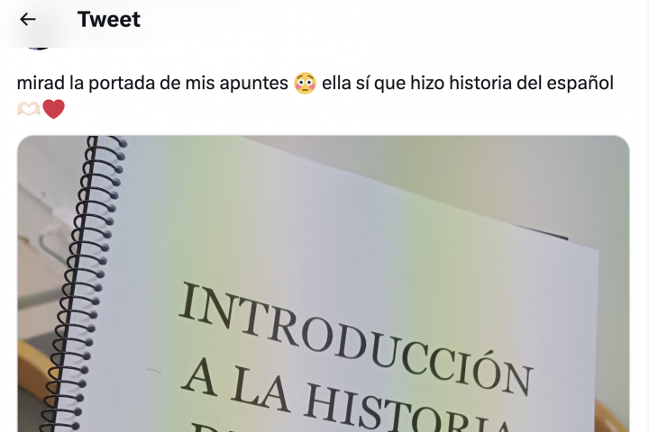 Un usuario de Twitter llamado @auskaloo se ha pasado el juego de las portadas de apuntes de Twitter con la que ha elaborado para su trabajo de Introducción a la historia del español.