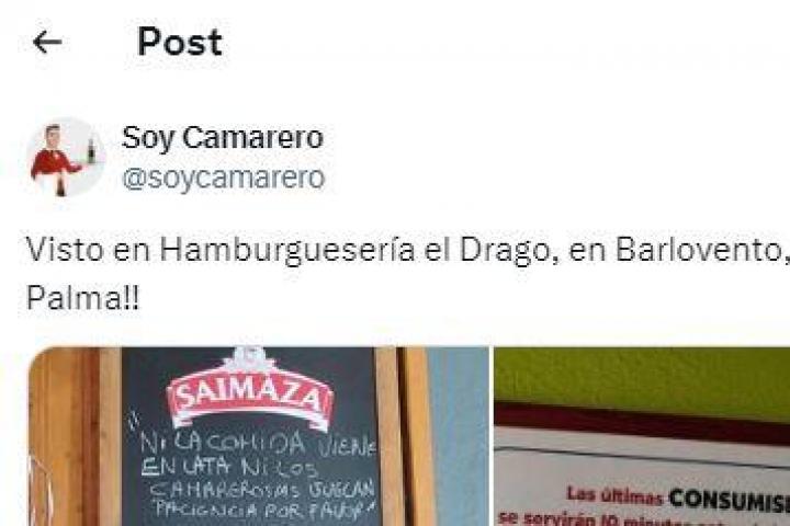Jesús Soriano, la persona que hay detrás de la popular cuenta @soycamarero, ha publicado los dos carteles que ha visto en la Hamburguesería El Drago, ubicada en el municipio de Barlovento (La Palma, Islas Canarias), con mensajes de los trabajadores a los clientes.