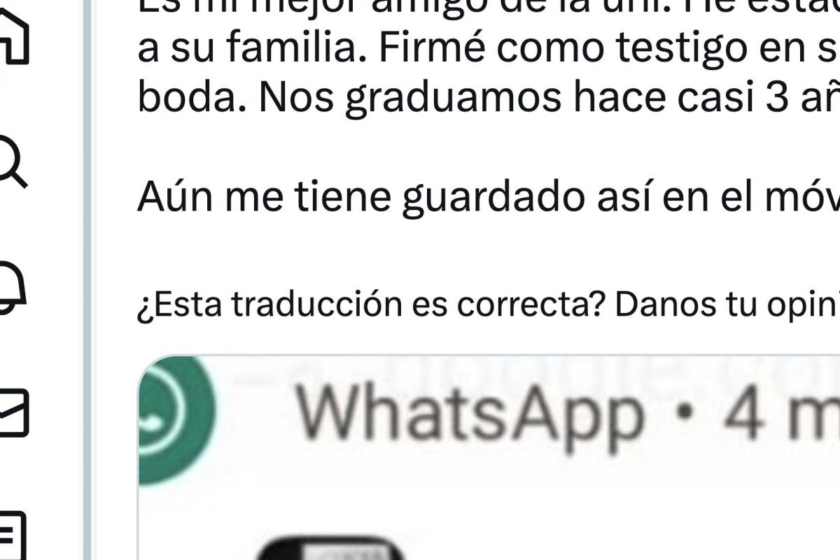 "Es mi mejor amigo de la uni. He estado en su casa 50mil veces. Conozco a su familia. Firmé como testigo en su boda e hice un discurso el día de la boda. Nos graduamos hace casi 3 años. Aún me tiene guardado así en el móvil", ha escrito en X.