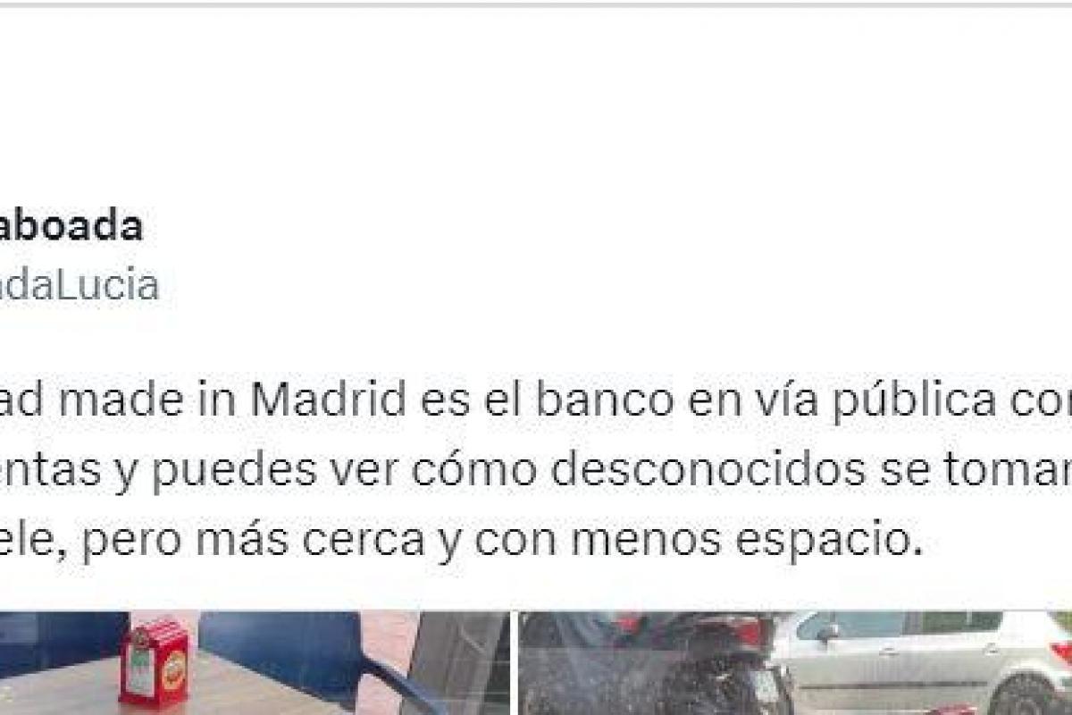 "Otra modalidad made in Madrid es el banco en vía pública con piernas a terraza", ha escrito la joven para criticar la situación.