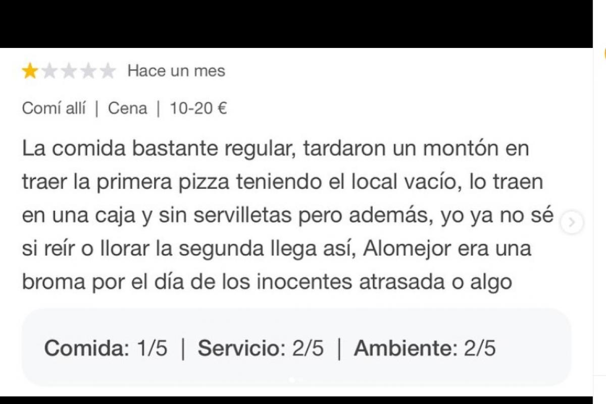 "La comida bastante regular. Tardaron un montón en traer la primera pizza teniendo el local vacío, lo traen en una caja de servilletas", empieza diciendo la usuaria en una opinión que ha dejado al restaurante.