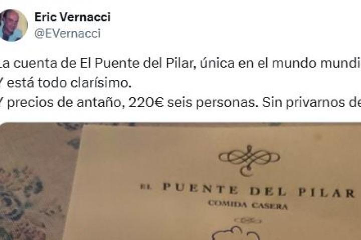 "La cuenta de El Puente del Pilar, única en el mundo mundial. Y está todo clarísimo. Y precios de antaño, 220€ seis personas. Sin privarnos de nada", ha comentado el tuitero, justo antes de adjuntar la imagen de la cuenta