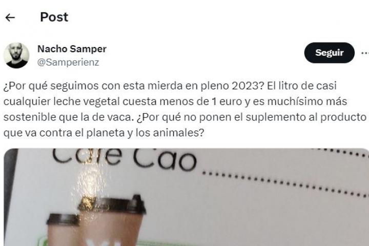 En este caso concreto, esta cafetería cobra 0,20 céntimos más por cualquiera de las tres mencionadas. "¿Por qué seguimos con esta mierda en pleno 2023?", ha preguntado molesto el tuitero.