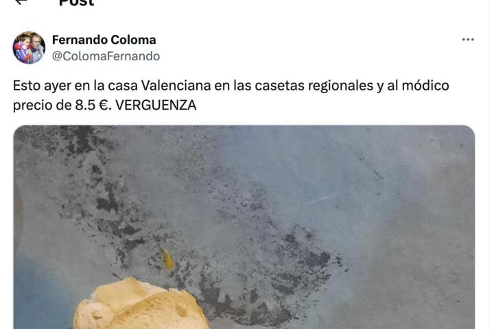 "Esto ayer en la casa Valenciana en las casetas regionales y al módico precio de 8.5 €. VERGUENZA", ha escrito en mayúsculas adjuntando una fotografía con la comida que ha levantado revuelo en la red social de Elon Musk.