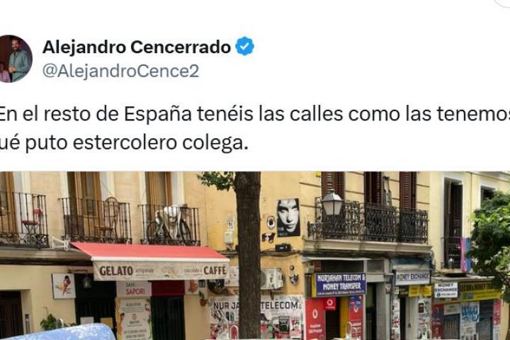 "¿En el resto de España tenéis las calles como las tenemos en Madrid? Qué puto estercolero, colega", ha escrito el usuario, junto a una imagen que se ha hecho viral con más de 120.000 reproducciones y 2.000 me gusta.