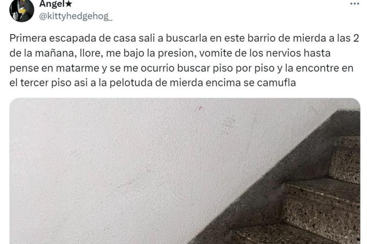 "Primera escapada de casa. Salí a buscarla en este barrio de mierda a las dos de la mañana. Lloré, me bajo la presión, vomité de los nervios, hasta pensé en matarme", ha manifestado el tuitero, contando el terrible mal rato que pasó.