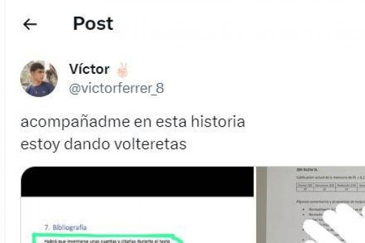 El usuario de X @victorferrer_8 ha publicado una fotografía del trabajo que le ha entregado a su profesor con la frase que se les ha colado en el apartado final de "bibliografía".
