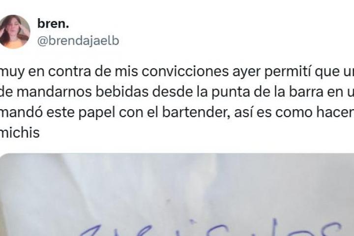 "Al final me mandó este papel con el bartender, así es como hacen negocios los michis", ha añadido la usuaria de X, justo antes de adjuntar una foto de la curiosa nota que le entregó el camarero.
