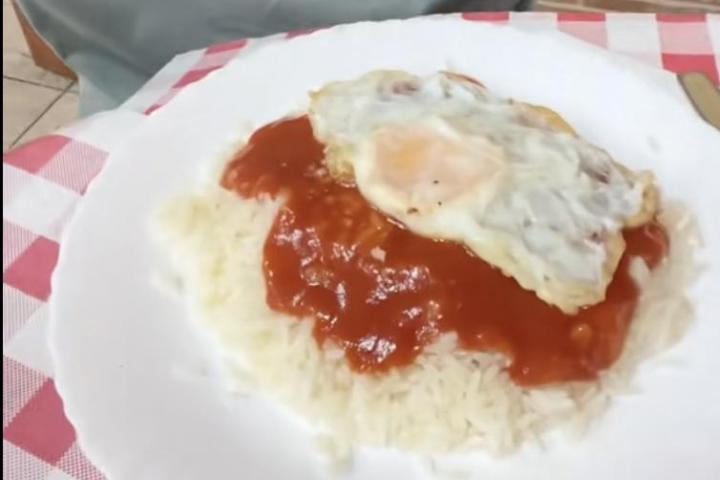 En el vídeo se puede ver que en el plato hay lo que en la península se conoce como un arroz a la cubana: un plato de arroz blanco con un poco de tomate frito y un huevo frito encima.