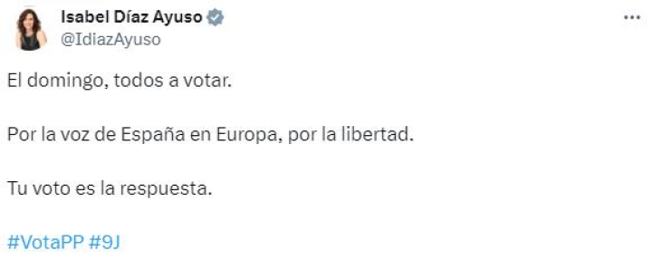 Un día antes de la jornada de reflexión los diferentes partidos políticos seguían con la campaña de cara a las elecciones europeas de este domingo 9 de junio. La presidenta de la Comunidad de Madrid, Isabel Díaz Ayuso, publicó un último tuit para animar a los ciudadanos a votar por la candidata del Partido Popular, Dolors Montserrat.