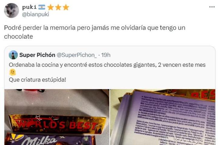 "Podré perder la memoria pero jamás me olvidaría que tengo un chocolate", ha escrito el tuitero, un texto que ha logrado mucha repercusión en la red social, llegando a los 1,5 millones de reproducciones, 80.000 me gustas y 12.000 retuits.