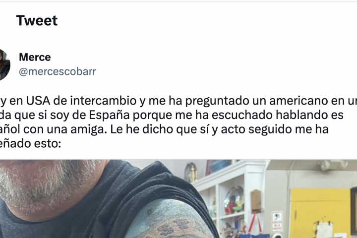 @mercescobarr ha explicado en la red social del pájaro azul que está de intercambio en Estados Unidos y que un señor que estaba en una tienda le ha preguntado si era española porque le ha escuchado hablar en español. Ella ha dicho que sí y él le ha mostrado el tatuaje que porta en su brazo izquierdo.