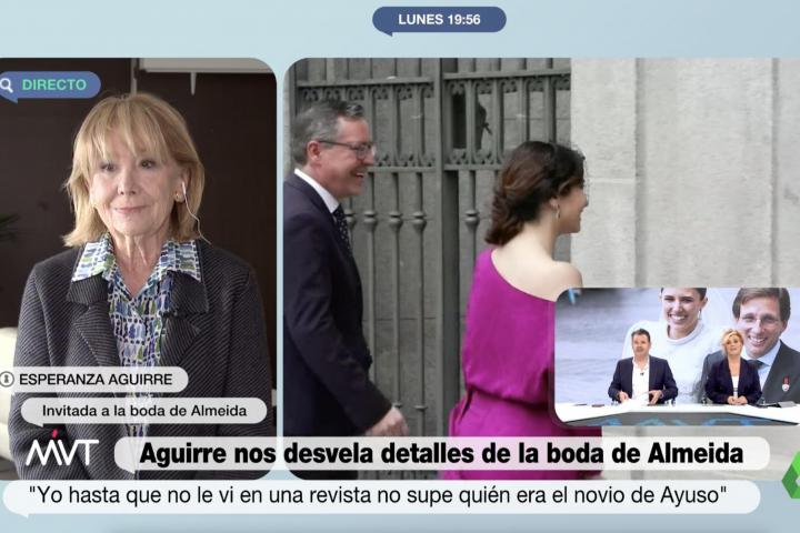 Esperanza Aguirre ha estado este lunes en Más Vale Tarde donde ha comentado los pormenores de la boda entre José Luis Martínez-Almeida y Teresa Urquijo. De hecho, la expresidenta de la Comunidad de Madrid fue protagonista involuntaria a cuenta de un comentario de su marido.