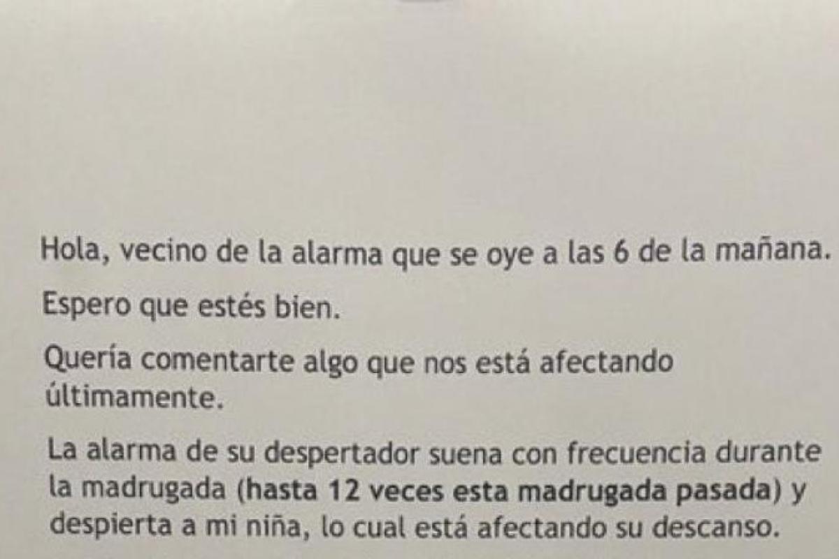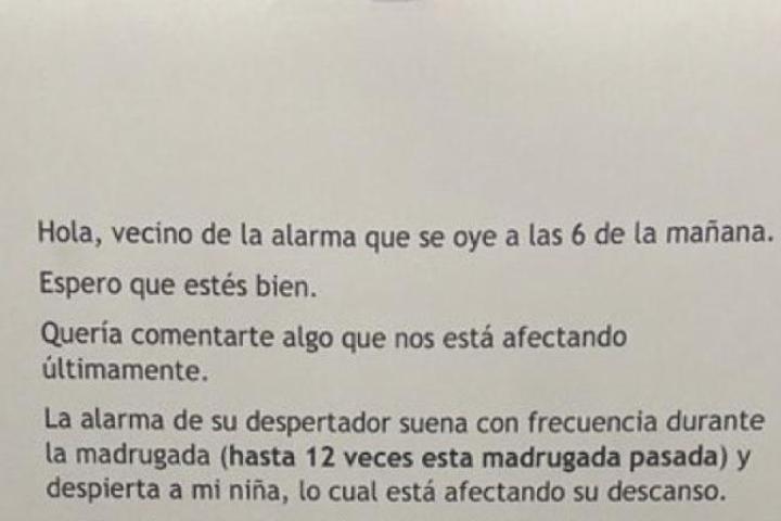 "Hola, vecino de la alarma que se oye a las 6 de la mañana. Espero que estés bien. Quería comentarte algo que nos está afectando últimamente. La alarma de su despertador suena con frecuencia durante la madrugada (hasta 12 veces esta madrugada pasada) y despierta a mi niña, lo cual está afectando su descanso", empieza diciendo.