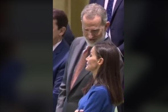 En un momento del acto se ve cómo Letizia se dirige al rey gesticulando con las manos de forma vehemente mientras él le devuelve una sonrisa. Luego hablan un rato más, ella más seria que él, que sigue sonriendo.