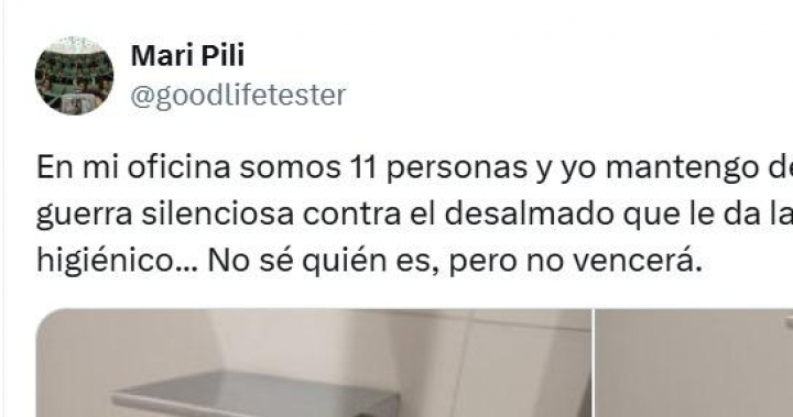 "En mi oficina somos 11 personas y yo mantengo desde hace 5 años una guerra silenciosa contra el desalmado que le da la vuelta al rollo de papel higiénico... No sé quién es, pero no vencerá", ha relatado la tuitera, justo antes de adjuntar dos fotografías.