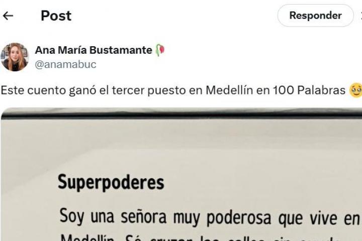 El cuento en cuestión se titula "Superpoderes" y dice: "Soy una señora muy poderosa que vive en Medellín. Sé cruzar las calles sin ayuda y coger el metroplús; esquivo a los ladrones y sé escoger muy bien los aguacates. Aprendí a escribir correos electrónicos y a retirar dinero".
