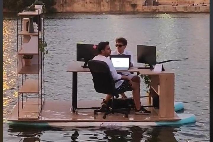 En concreto, los chavales están subidos a dos tablas de surf sobre las que han puesto una tabla de madera que hace de suelo y, encima de ella, se les puede ver a ellos sentados en do sillas de escritorio trabajando con dos portátiles y dos pantallas de ordenador